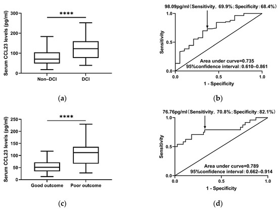 Serum CCL23 levels predict 6-month outcome of aSAH patients. (a) Boxplot shows serum CCL23 levels in patients with or without DCI. (b) ROC curve shows the discriminatory ability of serum CCL23 levels to predict DCI in aSAH patients. (c) Boxplot shows serum CCL23 levels in patients with or without DCI. (d) ROC curve shows the discriminatory ability of serum CCL23 levels to predict 6-month poor outcome in aSAH patients. Boxplots represent Turkey boxplots, and points outside the whiskers are outliers. Arrows represent the optimal cutoff value determined using the Youden index. **** p < 0.0001.