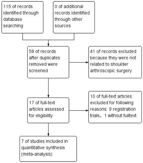 The details of the study selection process are presented in Figure 1. The literature search of the MEDLINE (17), Embase (25), Web of Science (18), and Cochrane Library databases (55) identified 115 RCTs. No additional studies were identified from the references of the included studies. Fifty-seven RCTs were excluded because of duplicate studies, and 41 RCTs were excluded after the titles and abstracts were scanned because they were not related to shoulder arthroscopic surgery. Registration trials without results were posted for nine studies. The full text was not found in one article. We finally included the following seven studies in this meta-analysis: Takahashi et al. [15], Bayram et al. [18] Mackenzie et al. [14], Liu et al. [11], Ersin et al. [12], Gao et al. [19], and Nicholson et al. [20].