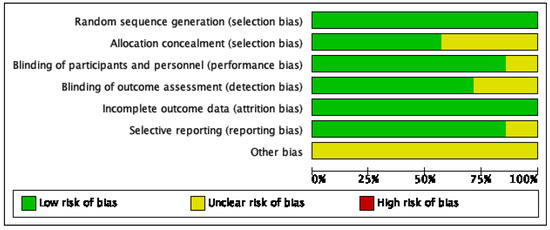 Risk of bias graph: review authors’ judgments about each risk of bias item presented as percentages across all of the included studies.