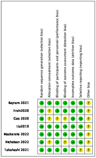 Risk of bias summary: review of authors’ judgments about each risk of bias item for each included study [11,12,14,15,18,19,20].