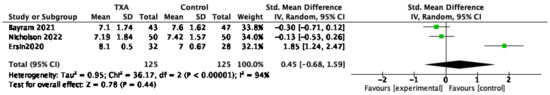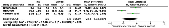 Three studies reported the amount of irrigation solution between the two groups [12,18,20]. The meta-analysis from three studies demonstrated no significant difference between the TXA and control groups (MD, −2.53 [95% CI, −5.93, 0.87]; p = 0.14; Figure 7). A random-effect model was used for substantial heterogeneity (I2 = 88%, p = 0.0002). The large degree of statistical heterogeneity indicates underlying differences among the studies. Having compared the image quality scores of the two groups in three studies, the image quality scores in Ersin et al.’s [12] study were significantly higher in the TXA group than in the controls. Two other studies found similar results for this index [18,20]. However, such a difference in Ersin et al.’s studies was not found to be statistically significant in the subsequent scoring.