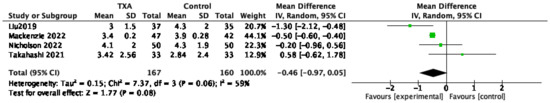 Five studies reported visual analog scale (VAS) pain scores on postoperative day 1. The meta-analysis from these five studies demonstrated no significant difference in VAS scores between the TXA and control groups (MD, −0.46 [95% CI, −0.97, 0.05]; p = 0.08; Figure 5). Statistical assessment for heterogeneity found for the VAS scores of the TXA versus control groups was I2 = 59% (p = 0.06). A random-effect model was used. The large degree of statistical heterogeneity indicates underlying differences among the studies. Although the dosage was different from 1–2 g, all four studies were given intravenously before surgery in the TXA group.