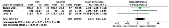 Five studies recorded the operation time [11,12,15,18,20]. The meta-analysis from these five studies demonstrated no significant difference between the TXA and control groups (MD, −3.51 [95% CI, −15.82, 8.80]; p = 0.58). When removing the study by Nicholson et al. [20] for it’s different general anesthesia and epinephrine of irrigation liquid, there was still no significant difference in operation time between the TXA and control groups (MD, 2.53 [−4.07 to 9.13]; p = 0.45), and there was less heterogeneity (I2 = 0%; p = 0.51, Figure 6).