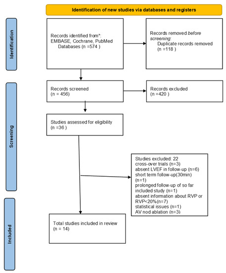 The systematic review and meta-analysis were performed according to the Preferred Reporting Items for Systematic Reviews and Meta-Analyses (PRISMA) statement for reporting systematic reviews and meta-analyses of RCTs. Our literature search identified 574 studies (Figure 1). After the exclusion of duplicates and non-relevant studies, 36 studies were retrieved for further full-text evaluation by reviewing study titles and abstracts. We further excluded three studies that were projected in cross-over manner [4,5,6], six trials that did not evaluate LVEF in the follow-up [7,8,9,10,11,12], seven studies in which information about RVAP was absent or RVAP was <20% [13,14,15,16,17,18,19], three studies in which patients were treated according to the ‘’ablate and pace” method [20,21,22], one trial with a short-term follow-up [23], one trial which was a prolonged follow-up of the so far included study, and one study because of statistical issues [24]. Finally, fourteen randomized controlled studies published in the period of 2008–2017 were included in this systematic review and meta-analysis.