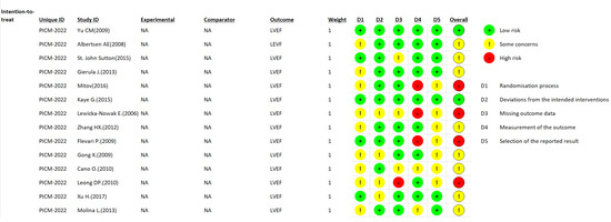 Risk of bias summary for the included studies. Green indicates low risk of bias. Red indicates high risk of bias. Yellow indicates some concerns [25,26,27,28,29,30,31,32,33,34,35,36,37,38].
