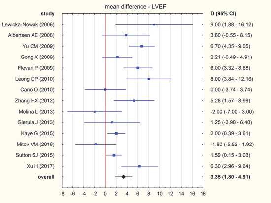 - LVEF. The mean difference between LVEF at baseline and after intervention amounted to 3.35% (95% CI: 1.80–4.91). A forrest plot of pooled differences is presented in Figure 3. There was substantial heterogeneity among the included studies: I2 = 72.1 (95% CI: 52.2–83.7) and T2 = 5.6 (95% CI: 2.4–11.0). The sensitivity analysis showed no significant changes in the overall result of the meta-analysis. When excluding individual studies from the calculations, the overall result was still above 3 and ranged from 3.01 (95% CI: 1.49–4.53) to 3.72 (95% CI: 2.19–5.26). No relationship has been found between effect sizes and standard errors: Begg–Mazumdar test; p = 0.625, Egger test; p = 0.775.