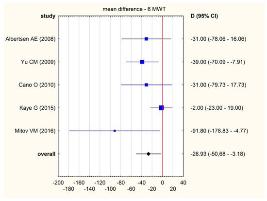 - 6 min walk test (6MWT). Six studies reported result of 6 min walk test both initially and at the end of the follow-up. The pooled mean difference was −26.93 m, which means that RVAP was associated with an increase in 6MWT after the intervention (Figure 4.). There was substantial heterogeneity across studies (I2 = 44.99%, 95% CI: 0.00–79.83%). The sensitivity analysis showed no significant changes in the overall 6MWT result. When excluding individual studies from the calculations, the range of values was from −21.04 (95% CI: −41.89–0.20) to −38.99 (95% CI: −61.14–16.85).