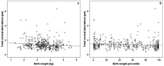 Scatterplot of total corneal aberrations and (a) birth weight and (b) birth weight percentile in individuals born at term (n = 261). Participants with a lower birth weight and birth weight percentile showed increased corneal aberrations.