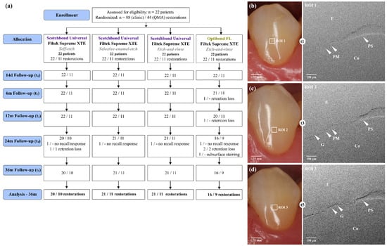 Experimental design and images. (a) CONSORT flow diagram. Clinical images at three recalls indicating the restoration and the region of interest (ROI) with areas of composite (Co), enamel (E), and the restoration margin; Sample 08, tooth 35. (b) The clinical and SEM image 14 days (t1) after restoration placement. Marginal adaptation and marginal staining were assessed with a score of 1 each. The SEM image shows a perfect restoration margin (PM) and a positive ledge (PL). (c) At 12 months (t3), marginal adaptation and marginal staining were clinically scored as 1 each, and a perfect margin, a small marginal gap (G) and a positive ledge appear in the SEM image. (d) At 36 months (t5), marginal adaptation and marginal staining were clinically scored as 1 each again, with the SEM image showing a more extended marginal gap and a positive ledge.