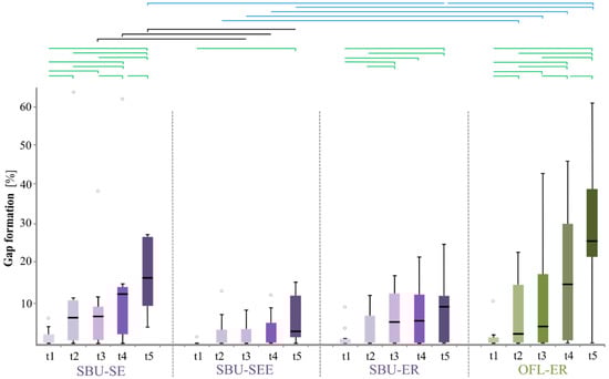 Boxplots of mean marginal gap formation (%) on restorations placed with composite and Scotchbond Universal in self-etch (SBU-SE), selective-enamel-etch (SBU-SEE) and etch-and-rinse (SBU-ER) application modes or with OptiBond FL (OFL) for the day 14 (t1) and 6 (t2), 12 (t3), 24 (t4) and 36 months (t5) follow-ups. Significant group differences (pi < 0.05) at each follow-up (black, blue) and the significant increase in marginal gap in the groups over time (green) are marked.