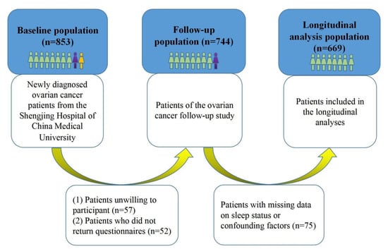 The OOPS is a prospective cohort study of OC women, aiming to evaluate associations between demographic, clinical, and lifestyle factors and OC prognosis [18,19]. This study has been conducted at the gynecological oncology wards at Shengjing Hospital of China Medical University, Shenyang, China, since 2015. The patients should meet the following criteria: (1) women with newly diagnosed OC; (2) women with age at diagnosis between 18 and 79 years old; (3) women who are conscious and able to answer questionnaires. A total of 853 women with newly diagnosed OC were identified from January 2015 to December 2020. Among them, a total of 796 women (93.32%) agreed to participate. Of the 796 women, 744 (87.22%) women returned the study questionnaires. Additionally, we further excluded patients with missing data on sleep status or potential confounding factors (n = 75), leaving 669 eligible OC patients for the final analysis (Figure 1). The study was approved by the Institutional Review Board of the Ethics Committee of Shengjing Hospital of China Medical University and all the patients have signed the informed consent.