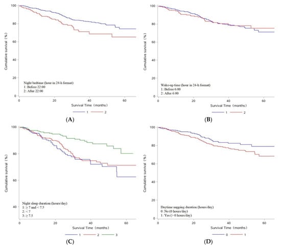 In our analyses, pre-diagnosis sleep parameters included night bedtime, wake-up time, night sleep duration, daytime napping duration, total sleep duration, sleep quality, and sleep pattern. In a previous study on sleep and risk of OC, night sleep duration of 7 h/day was taken as the reference [15]. Therefore, with a 30 min interval, we used sleep duration of 7–7.5 h per night as a reference. Further, 7.5–8 h/day was taken as a reference for total sleep duration. In addition, a study on night bedtime and health among middle-aged and older adults took “before 10:00” as the reference [24]. Since OC patients are mostly middle-aged and elderly, we also adopted “before 10:00” as a reference for night bedtime in our study. Correspondingly, “before 6:00” was used as a reference for wake-up time. Further, sleep patterns were divided into four groups based on night bedtime and wake-up time: early bed-early rise (before 22:00 and before 6:00, reference group), early bed-late rise (before 22:00 and after 6:00), late bed-early rise (after 22:00 and before 6:00), and late bed-late rise (after 22:00 and after 6:00).