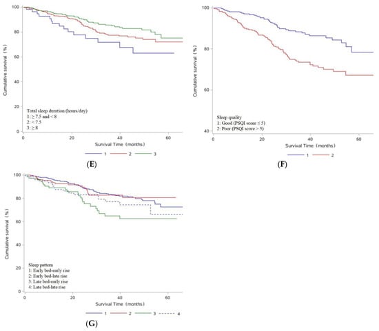 Kaplan–Meier survival curves for night bedtime (A), wake-up time (B), night sleep duration (C), daytime napping duration (D), total sleep duration (E), sleep quality (F), and sleep pattern (G).