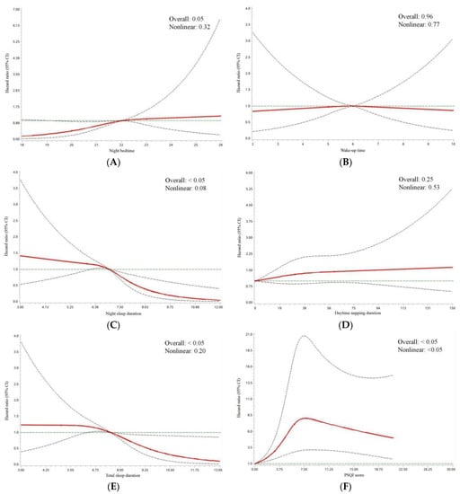 We further explored the non-linear associations between pre-diagnosis sleep status and OS (Figure 3) and found a curvilinear association between PSQI score and OS (pnonlinear <0.05). OC patients had the worst OS with a PSQI score of 7.7 to 7.8 (HR = 8.05).