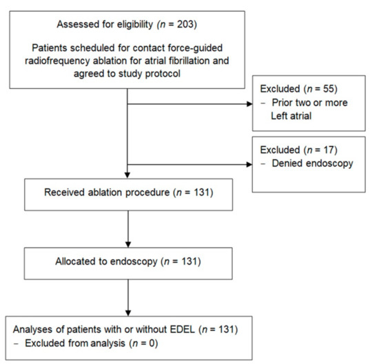Consecutive patients who were scheduled for contact force-guided RF ablation of AF as an index or re-do procedure were assessed for eligibility in this single-center prospective study. Inclusion criteria were symptomatic paroxysmal or persistent AF with or without left atrial tachycardia (LAT), patient preference and ineffectiveness, and contraindications or refusal of antiarrhythmic drugs according to the guidelines [18,19]. Patients who received re-do procedures were only included if wide antral circumferential PV re-ablation (WACA) was performed. Patients who agreed to undergo postprocedural endoscopy and agreed to the study protocol were enrolled in the final analyses (Figure 1). Exclusion criteria were intracardiac thrombi, known severe esophageal disease and re-do procedures with conventional gap ablation. Patients with two or more prior left atrial ablation procedures were also excluded.