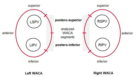 Contact-force parameters were assessed for ablation applications at the posterior segments of the WACA line, e.g., postero-superior and postero-inferior around the left- and right-sided PVs (Figure 2).