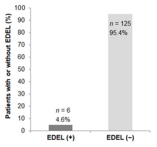 Patients with EDEL were less frequently overweight (1/6 [17%] vs. 85/125 [68%]; p = 0.02), tended to have a lower BMI (24.5 ± 4.1 vs. 27.4 ± 4.1; p = 0.09) and showed significantly higher creatinine levels (1.55 ± 1.18 vs. 1.07 ± 0.42 mg/dL; p = 0.02) as compared to EDEL(−) patients, respectively. All other parameters, including the CHA2DS2-VASc score, C-reactive protein and white blood cell count before or after the procedure, did not show significant differences between groups (Table 1).