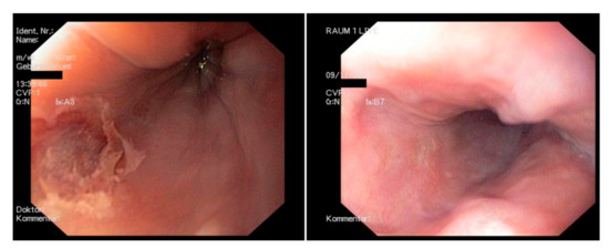 Esophageal thermal lesions were diagnosed in 6 of 131 patients (4.6%) (Figure 3) whereby five were classified as KCC type 2a lesions and one as a KCC type 1 lesion. The most extensive finding was a longitudinal erythematous mucosal erosion of 40 × 20 mm at 30 cm from the incisors (KCC type 2a) (Figure 4). Further findings were a small longitudinal ulceration of 6 mm in length surrounded by a slight erythema at 30 cm from the incisors (KCC type 2a), a circular erosion of 10 mm in diameter at 31 cm from the incisors (KCC type 2a), two reddish, partly fibrinous erosions of 20 mm at 25 cm from the incisors (KCC type 2a), a small erythematous lesion of 3 mm at 22 cm from the incisors (KCC type 1), and a small fissural lesion of 2 × 5 mm at 33 cm from the incisors (KCC type 2a). None of these patients developed clinical symptoms, such as odynophagia, hemoptysis or symptomatic reflux. Two patients denied further endoscopic follow-up. Healing was documented in three patients during a follow-up endoscopy within 2 weeks after the procedure and in one patient during a third endoscopy 5 weeks after the procedure (Figure 4). Notably, only 8% (n = 11) of the total cohort showed entirely unsuspicious endoscopy results. In 120 patients, gastritis (n = 104), glycogen acanthosis (n = 24), esophagitis (n = 23), hernia (n = 19), Barrett’s esophagus (n = 16), varices (n = 10) and other abnormalities (n = 24) were noticed.