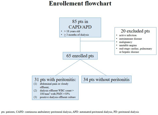 This cross-sectional study was carried out in the PD Center at San Bortolo Hospital in Vicenza, Italy. All subjects (>18 years old) regularly treated by PD for a minimum of 3 months were consequently eligible for this research. In total, 85 sequential PD patients were screened, and 20 of them were excluded due to an active systemic infection (other than peritonitis), such as autoimmune disease, malignancy, unstable angina, or end-stage cardiac, pulmonary, or hepatic disease.