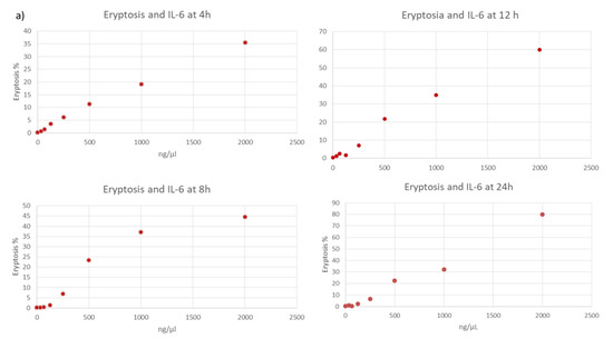 The cytotoxic influence of cytokines was studied in vitro on healthy RBCs at different time points (4, 8, 12, and 24 h). RBCs incubated with IL-6, IL-18, and IL-1β demonstrated a significant increase in eryptosis. Cytofluorimetric results show significantly increased rates of eryptosis in healthy RBCs incubated with greater concentrations of cytokines in comparison with other lower concentrations and negative control/untreated cells/healthy RBCs (p < 0.05). Figure 2 describes eryptosis inducted by the in vitro exposure to cytokines at several dilutions of these selected molecules and at different time points (Figure 2).