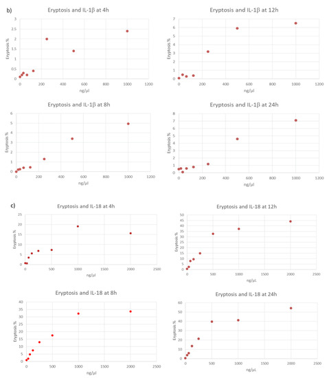 Numerous studies support the role of immune system dysregulation and inflammatory pathway activation during eryptosis [9,22,23,24]. In our in vitro study, we visibly highlighted the cytotoxic effect of cytokines on healthy RBCs, showing that they induce elevated eryptosis. This in vitro-induced eryptosis was noticed for all time points and all concentrations, in comparison with untreated RBCs. Obviously, a higher eryptosis level was observed for RBCs treated with a higher concentration of IL-6, IL-18, and IL-1β. These results expanded (more cytokines and more time points) and confirmed data obtained from our previous studies regarding eryptosis induced by inflammation markers and uremic toxins [20]. In particular, our results are supported by Bester et al., who examined the role of IL-1β, IL-6, and IL-8 upon the structure of erythrocytes and platelets [25]. All three interleukins were found to be responsible for the increased hypercoagulability of whole blood. Importantly, the RBC structure was particularly modified by the presence of IL-8, which causes evident structural modifications to the erythrocyte membranes and induces eryptosis initiation [25]. There is no evidence regarding the role of IL-8 in the trigger of eryptosis; nevertheless, it is a recognized stimulator of apoptosis, and it is closely involved in the traditional apoptotic pathways [25].