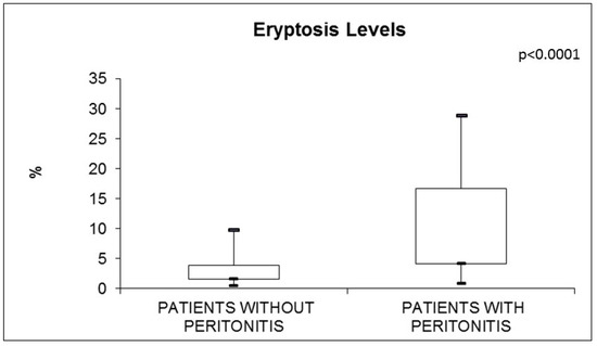 To our knowledge, this is the first demonstration of alterations in eryptosis during peritonitis in the PD population in comparison with PD-stable patients. Furthermore, this study reported and confirmed the association between eryptosis and inflammation during peritonitis. In particular, in this research, we investigated the eryptosis levels in PD-related peritonitis and we evaluated the relationship between eryptosis and conventional and unconventional inflammatory indices in PD patients with peritonitis in in vivo and in vitro settings (confirmation and integration of previous results) [20].