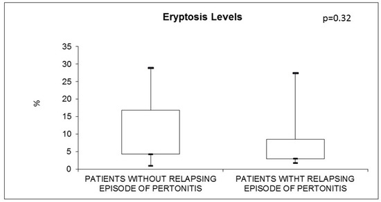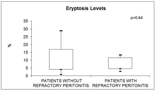 Additionally, we analyzed subjects with PD-related- peritonitis. There was no significant difference in the value of eryptosis in patients with or without relapsing episodes of peritonitis (p = 0.32) (Figure 4). In the same way, eryptosis did not differ in subjects with or without refractory episodes of peritonitis (p = 0.64) (Figure 5).