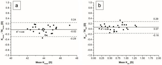Bland–Altman plots of comparison between K and TK using (a) mean values, (b) astigmatism magnitude.