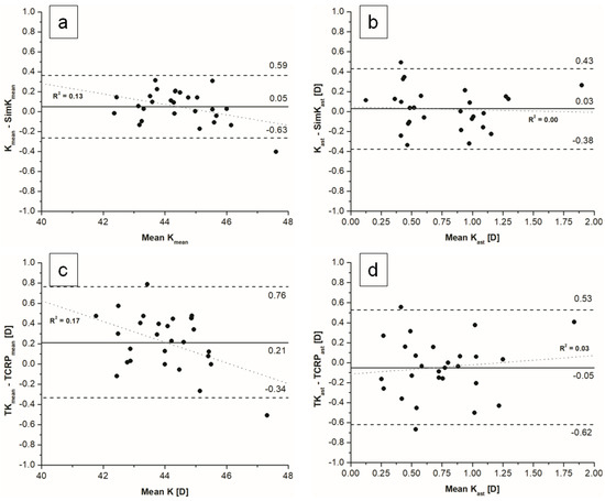 Bland–Altman plots of comparison between K and simK using (a) mean values, (b) astigmatism magnitude and for TK and TCRP using (c) mean values, (d) astigmatism magnitude.