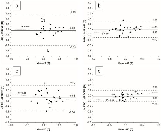 Bland–Altman plots for astigmatism vector analysis for K and simK (a) J0, (b) J45 and for TK and TCRP (c) J0, (d) J45.