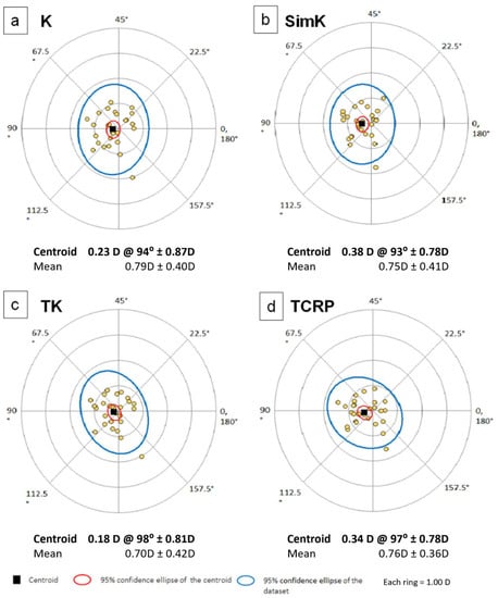 Double-angle plots showing the astigmatism measured with (a) K, (b) simK, (c) TK, (d) TCRP. K—keratometry; simK—simulated keratometry; TK—total keratometry, TCRP—total corneal refractive power.