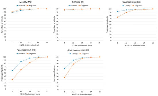 Figure 1 compares the limitations within the five EQ-5D-5L dimensions between migraine patients and the matched general population cohort. Level 1 means no limitations on a given domain, and level 5 means extreme limitations. According to the previously published data [34], in the general population of Poland, the dimension with the lowest number of limitations is self-care, and the dimensions with the highest number of limitations are pain/discomfort and anxiety/depression. The visual analysis of the graphs indicated that within the two dimensions (mobility, self-care), there are no significant differences in the rate of limitations between migraine patients and the general population. Migraine diagnosis has the most significant impact on the increase in the incidence of limitations within the pain/discomfort dimension (the largest area between the two curves), followed by the anxiety/depression and usual activities dimensions.