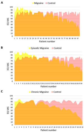 The burden of (A) migraine, (B) episodic migraine and (C) chronic migraine according to the EQ VAS. Pink color denotes the quality of life lost due to the disease in comparison to controls from the general population.