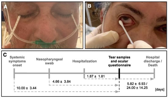 Samples were collected using Schirmer strips and conjunctival swab after hospitalization, and patients were followed until discharge or death. (A) Collection of Schirmer strips. (B) Collection of conjunctival swab. (C) Overview of timepoints of sample collection. Numbers indicate mean days and standard deviation between the indicated event and tear sample collection.