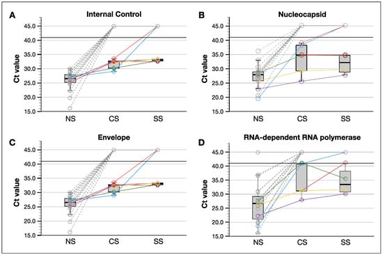 Nasopharyngeal swabs had lower cycle threshold values than tear samples. (A) Internal control. (B) Nucleocapsid. (C) Envelope. (D) RNA-Dependent RNA Polymerase. Colored and grey lines represent, respectively, patients with a positive and negative detection of SARS-CoV-2 in tear samples, each different colored line represent the same patient. Black line shows the cut off value for test positivity. Each dot corresponds to one patient. CS: conjunctival swab; E: envelope; IC: internal control; N: nucleocapsid; Na: nasopharynges; RdRp: RNA-dependent RNA polymerase; SS: Schirmer strip.
