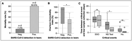 SARS-CoV-2 detection in tear samples is associated with mortality rate, Charlson Comorbidity Index, and sample collection timing. (A) Patients who had viral particles detected in tear samples had a higher mortality rate. (B) Boxplot comparing CCI and SARS-CoV-2 detection in tear samples. (C) Boxplot comparing critical periods of sample collection. Timing represents the number of days between tear collection and the events on the X-axis. *: p < 0.05. Ho.: hospitalization; Neg.: negative SARS-CoV-2 in tear samples; NS: nasopharyngeal swab; Pos.: positive SARS-CoV-2 in tear samples; SSO: systemic symptoms onset.