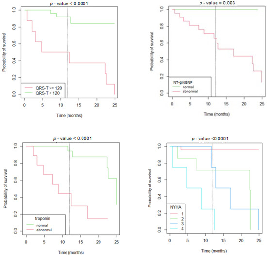 Kaplan–Meier survival curves according to the value of the QRS-T angle, serum concentrations of NT-proBNP and troponin, and NYHA/Ross scale.