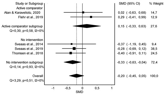 A comparison was made by subgroups and one overall. Starting with the first analysis, the meta-analysis showed no significant differences in favor of HIIT when compared to an active comparator (yoga [39] or recommendations about exercise [38]) (n = 87; SMD = 0.15; 95% CI: −0.33, 0.63; heterogeneity Q value: 0.3; p = 0.58; I2 = 0%). However, the meta-analysis showed significant changes in favor of HIIT when compared against no intervention (n = 161; SMD = −0.33; 95% CI: −0.63, −0.04; heterogeneity Q value: 0.14; p = 0.93; I2 = 0%). Finally, overall, the meta-analysis showed no statistically significant differences in the resting heart rate in five studies [38,39,41,42,44] (n = 248; SMD = −0.20; 95% CI: −0.45, 0.05; heterogeneity Q value: 3.29; p = 0.51; I2 = 0%) showing no heterogeneity (Figure 1). The visual evaluation of the funnel and Doi plot showed a minor asymmetry (LFK index = 1.67) (Appendix A). A subgroup analysis showed statistically significant differences when HIIT training is compared with no intervention.