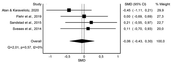 The meta-analysis showed no statistically significant differences in the resting systolic blood pressure in four studies [38,39,42,45] (n = 119; SMD = −0.06; 95% CI: −0.43, 0.30; heterogeneity Q value: 2.01; p = 0.57; I2 = 0%) showing no heterogeneity (Figure 2). The visual evaluation of the funnel and Doi plot showed no asymmetry (LFK index = 0.00) (Appendix A).