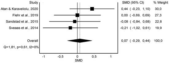 The meta-analysis showed no statistically significant differences in the resting diastolic blood pressure in four studies [38,39,42,45] (n = 119; SMD = 0.07; 95% CI: −0.29, 0.44; heterogeneity Q value: 1.81; p = 0.61; I2 = 0%) showing no heterogeneity (Figure 3). The visual evaluation of the funnel and Doi plot showed no asymmetry (LFK index = −0.02) (Appendix A).