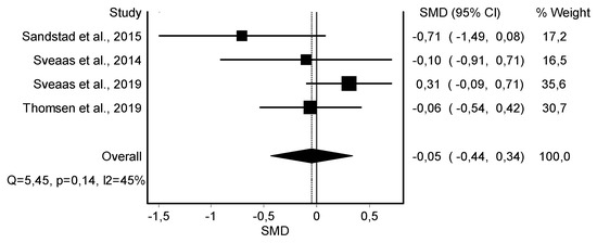 Two studies assessed the effect of HIIT training—against usual care or no intervention—on waist circumference [41,42,45]. Sandstad et al. found only statistically significant differences over time in the HIIT group [45]. Waist circumference results were not pooled because two studies only analyzed patients with baseline-increased circumference (males ≥94 cm and females ≥80 cm) [41,42]. In those patients, they found contrary results on the efficacy of HIIT training; nonetheless, Sveaas et al. included a larger sample in 2019 and found a significant treatment effect [41,42].