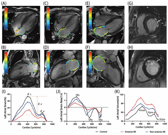 Typical examples of control ((A,B) and black line), non-anterior MI ((C,D,G) and blue line) and anterior MI ((E,F,H) and red line). (A,C,E) 4-chamber view of LA systolic phase, (B,D,F) 2-chamber view of LA systolic phase (the LA color varies strain parameters). (G) = lateral MI, (H) = anterior MI. (I–K) Curves showing LA strain, strain rate and volume in 25 phases, respectively. MI size was larger in the patient with anterior MI (16.9 vs.10.1%). εs = total strain; εe = passive strain; εa = active strain; SRs = total strain rate; SRe = passive strain rate; SRa = active strain rate.