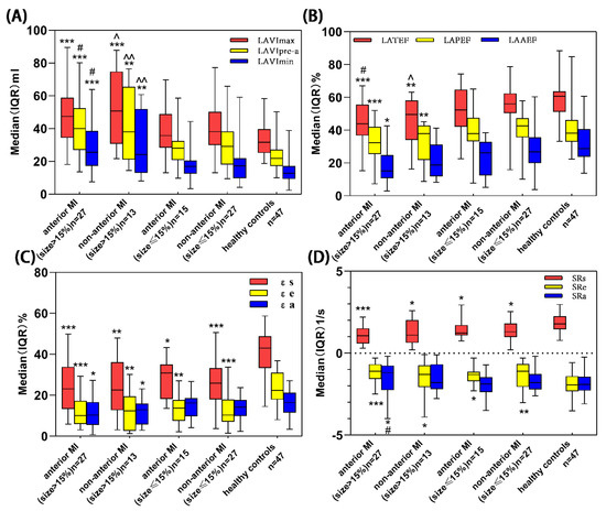 Kruskal–Wallis H was performed for comparisons of LA volume (A), LAEF (B), LA strain (C) and their corresponding strain rate (D) parameters among five groups (anterior MI (size > 15%), non-anterior MI (size > 15%), anterior MI (size ≤ 15%), non-anterior MI (size ≤ 15%) and healthy controls). 15% = median of MI size [8]. * p < 0.05 vs. healthy controls; ** p < 0.01 vs. healthy controls; *** p < 0.001 vs. healthy controls; ^ p < 0.05 vs. non-anterior MI (size ≤ 15%); ^^ p < 0.01 vs. non-anterior MI (size ≤ 15%); # p < 0.05 vs. anterior MI (size ≤ 15%). LA = left atrial, MI = myocardial infarction.