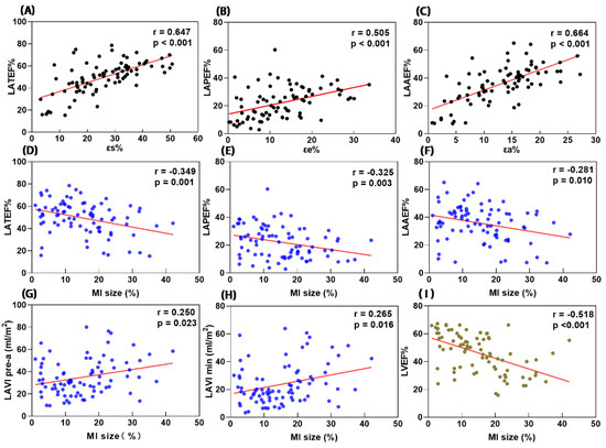 Scatter plots showing correlations of LATEF and εs (A), LAPEF and εe (B), LAAEF and εa (C), LA function and MI size (D–F), LA volume and MI size (G,H), LVEF and MI size (I). LA = left atrial, LV = left ventricular, EF = emptying fraction, εs = total strain, εe = passive strain, εa = active strain.