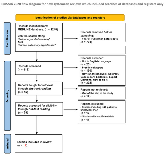 A systematic review of the literature was conducted using a formal strategy (https://www.ncbi.nlm.nih.gov/pubmed; accessed on 15 September 2022) and according to the Preferred Reporting Items for Systematic Reviews and Meta-Analysis (PRISMA) Statement [22]. To retrieve all the publications dealing with the topic of interest, the query string was composed as “Pulmonary Endarterectomy AND Chronic pulmonary hypertension”.