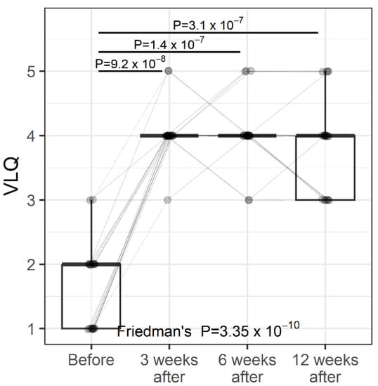 Vaginal laxity was assessed by a non-standardized subjective vulvovaginal laxity questionnaire (VLQ) using a 7-point Likert scale. Participants were eligible if they self-reported a perception of vaginal laxity defined as ‘‘very loose’’, ‘‘moderately loose’’, or ‘‘slightly loose’’, on a 7-point Likert scale [,]. Data were collected before the first treatment and during a consecutive follow-up visit. Average improvement was calculated. VL changed significantly over time (Figure 1, p < 0.0001). Post-hoc comparisons revealed that significant differences were found between study entry and follow-up visits, but not between follow-up visits. The percentage change between the first two weeks (before versus 2 weeks after) ranged from 33.3% to 300%, with a median percentage change of 125%. A total of 8 women showed a change of 100%, one women of 150%, one women of 200%, and eight women of 300%.