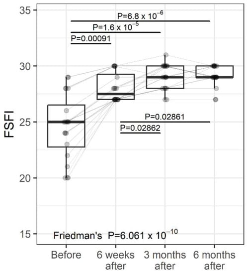 The FSFI is a widely accepted, global evaluation used in female sexual medical trials []. The FSFI is a 19-item questionnaire divided into 6 domains: desire, arousal, lubrication, orgasm, satisfaction, and pain, which evaluate a woman’s recent state of sexual function (within the past 4 weeks). The domain scores combine to create a total score (range 2–36). A total FSFI score of 26 is recognized in the medical literature as indicating female sexual dysfunction (FSD). A change in FSFI during the study was significant (Figure 2, p < 0.0001). a 6-week follow-up demonstrated significantly improved FSFI scores (from 25 (3.8) to 32 (2.25), median (IQR), p < 0.0001) and remained significantly better at 3 months follow-up (29 (2), p < 0.0001 versus baseline, and 6 months follow-up (29(1)), p < 0.0001 versus baseline. Percentage change—Before vs. 6 weeks: median 12%; 75% of women had a percentage change of at least 7.8%; 25% of women had a percentage change of at least 18.7%. Percentage change—Before vs. 3 months: median 17%; 75% of women had a percentage change of at least 10.4%; 25% of women had a percentage change of at least 25.6%. Percentage change—Before vs. 6 months: median 16.7%; 75% of women had a percentage change of at least 11.2%; 25% of women had a percentage change of at least 25.6%. Percentage change—6 weeks vs. 3 months: median 3.7%; 25% of women had a percentage change of at least 7.1%. Percentage change—6 weeks vs. 6 months: median 3.6%; 25% of women had a percentage change of at least 7.4%.