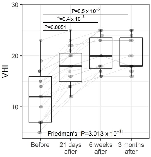 Vaginal health regarding GSM was evaluated by the Vaginal Health Index (VHI). The VHI consists of the clinical analysis during the specular examination of five parameters and is graded from 1 to 5. The sum of the values of the parameters evaluated results in the total vaginal health score. VHI scores are for vaginal moisture, vaginal fluid volume, vaginal elasticity, pH, and vaginal epithelial integrity. The lower the score, the higher the atrophy. The sum of the values of the evaluated parameters results in the total vaginal health score. When the overall score is less than 15, the vaginal mucosa is considered atrophic [,]. VHI was measured at baseline and at three follow-up visits (Figure 3). Overall, there was a significant improvement in the VHI score over time, with the greatest and most significant change occurring between the baseline and at 21 days follow-up (p = 0.006). The VHI score leveled off at 21-days follow-up, and no significant changes were found between follow-up visits thereafter. Percentage change—Before vs. 21 days: median 41.7%; 75% of women had a percentage change of at least 18.8%; 25% of women had a percentage change of at least 100%. Percentage change—Before vs. 6 weeks: median 50%; 75% of women had a percentage change of at least 41.4%; 25% of women had a percentage change of at least 128%. Percentage change—Before vs. 3 months: median 64.3%; 75% of women had a percentage change of at least 37.3%; 25% of women had a percentage change of at least 129%.