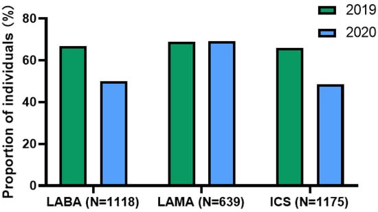 Proportion of individuals with high adherence to their controllers. Abbreviations: LABA, long-acting β2-agonists; LAMA, long-acting muscarinic antagonists; ICS, inhaled corticosteroid.