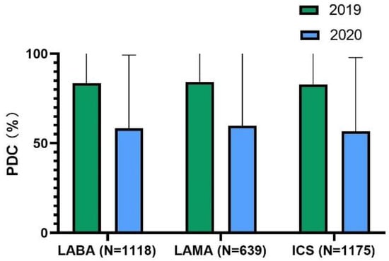 Medication refill histories based on pharmacy claim data were used to measure patient adherence to maintenance inhalers at a fixed time from 1 January to 31 July 2019, and 1 January to 31 July 2020. The proportion of days covered (PDC) was used to calculate a patient’s adherence. The calculation for PDC equaled the number of covered days with a targeted medication divided by the number of days in a period. The tracking period started with the patient’s first fill during the observation period. If a PDC could not be calculated, it was assumed that the patient had a PDC of 0%. Patients with a PDC below 80% were considered non-adherent, and greater or equal to 80% were considered highly adherent. Supplemental Table S1 shows a detailed list of medications assessed in this study.